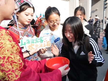11月5日,由厦门博饼状元郎、漳州布袋木偶戏、泉州蟳埔女、三明畲家阿妹、龙岩提线木偶戏组成的闽西南快闪小分队在延大网红墙惊喜亮相,古今交融的创新表演瞬间吸引不少市民游客驻足围观,纷纷参与互动,让“山海闽西南”的魅力在流动的舞台中触手可及。一位市民在接受记者采访时说道,“蟳埔女和畲族阿妹的装扮很美,木偶戏的表演很神奇,还免费品尝到闽西南的‘早茶晚咖’,味道很独特!最开心的是体验学讲闽南话和客家话,虽然短短两句,但互动感很棒!”
